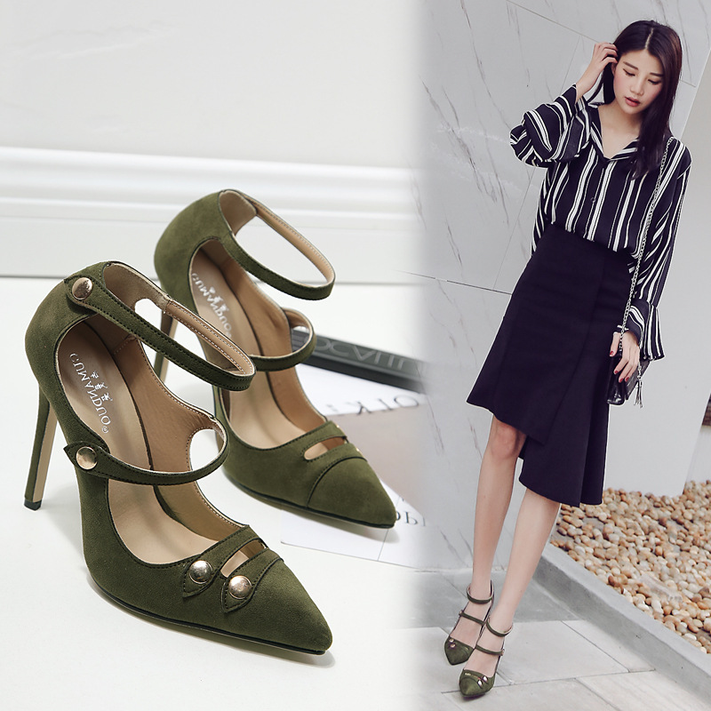 Pure Color Suede Stileto Heel Pionted Toe Ankle Strap High Heels Q-0079