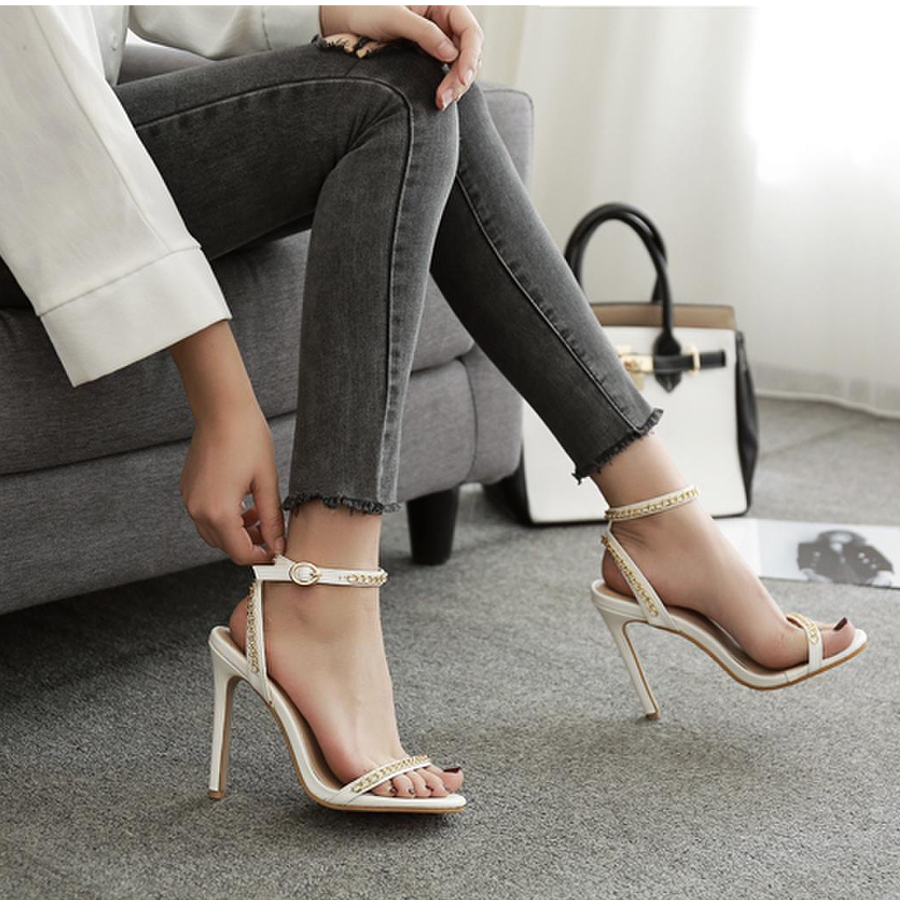 Metal Chain Stiletto Heel Open-toe Ankle Strap High Heel Simple Sandals Q-0090