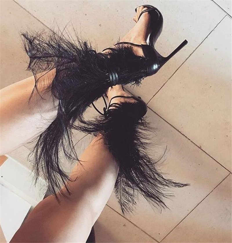 Super Hot Black Feather Back Open Toe Women Sandals Concise Style Ladies Lace Up High Heels Fashion Gladiator Sandals G-2982