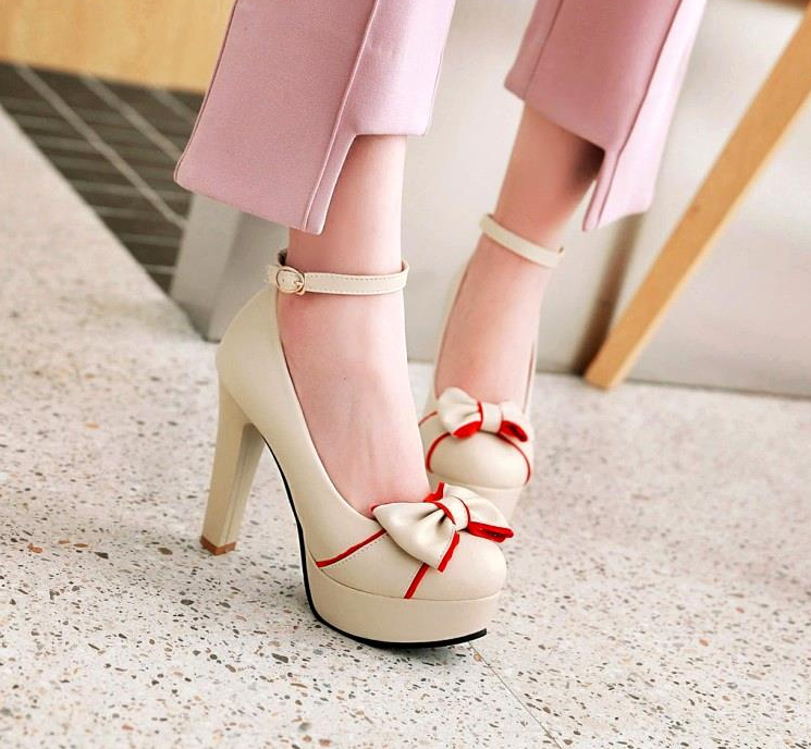 Pink Round Toe Chunky Bow Sweet High-Heeled Shoes G-3038