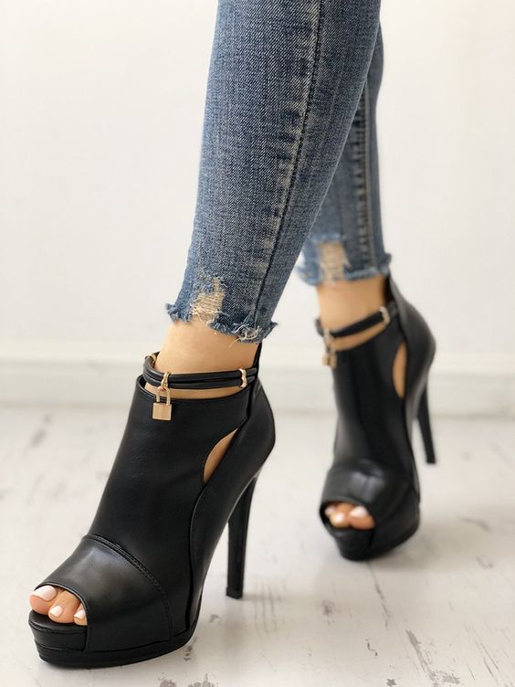 Black Solid Cut Out Platform Thin Heeled Sandals F6752