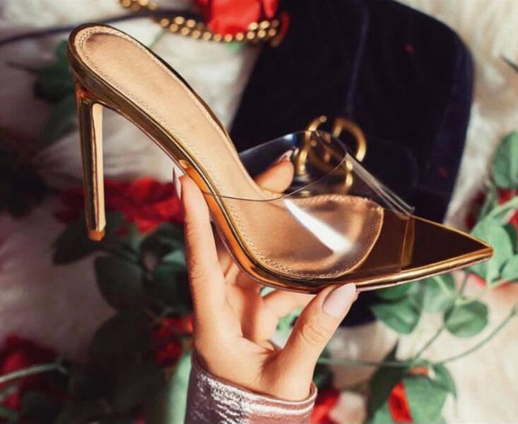 Women's Shoe Pointed Transparent Golden Retro Stiletto Sandals And Slippers Wedding Shoes D5721