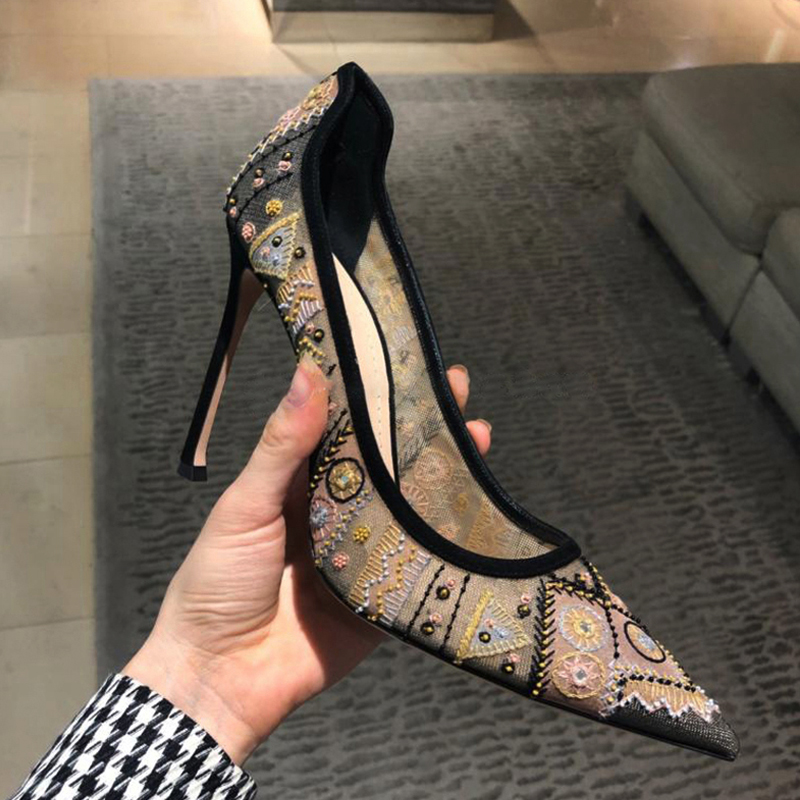 Black high heels women's stiletto 10cm embroidered lace and gauze pumps S-278