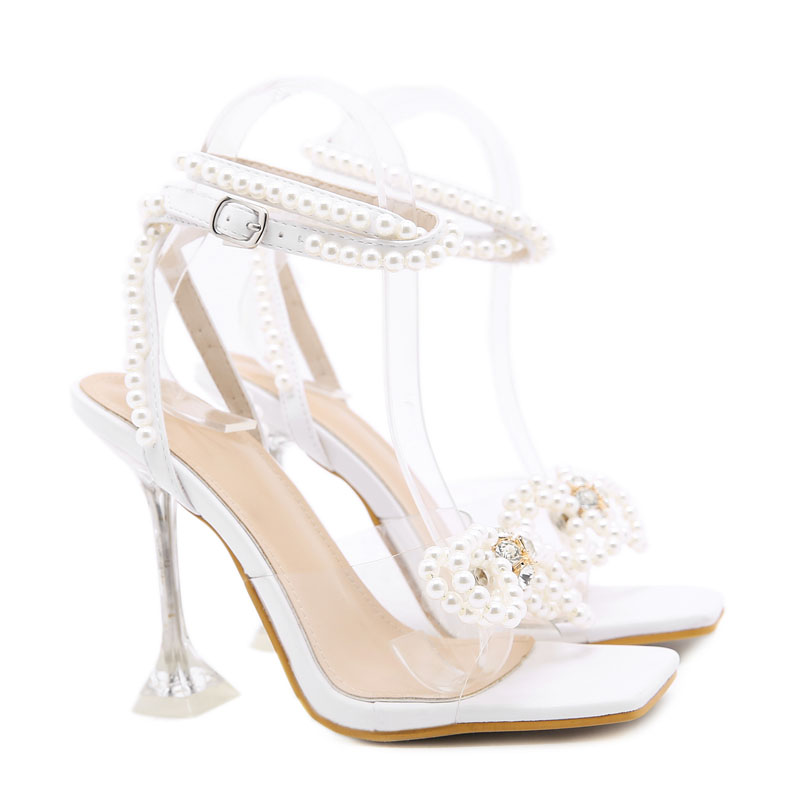 Women's pearl rhinestone bow tie transparent wine glass heel sandals S-386