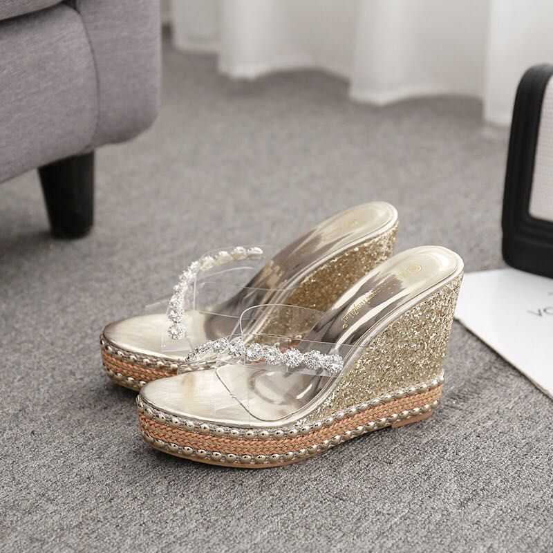2021 new wedge with sequins cross rhinestone transparent sandals and slippers S-477
