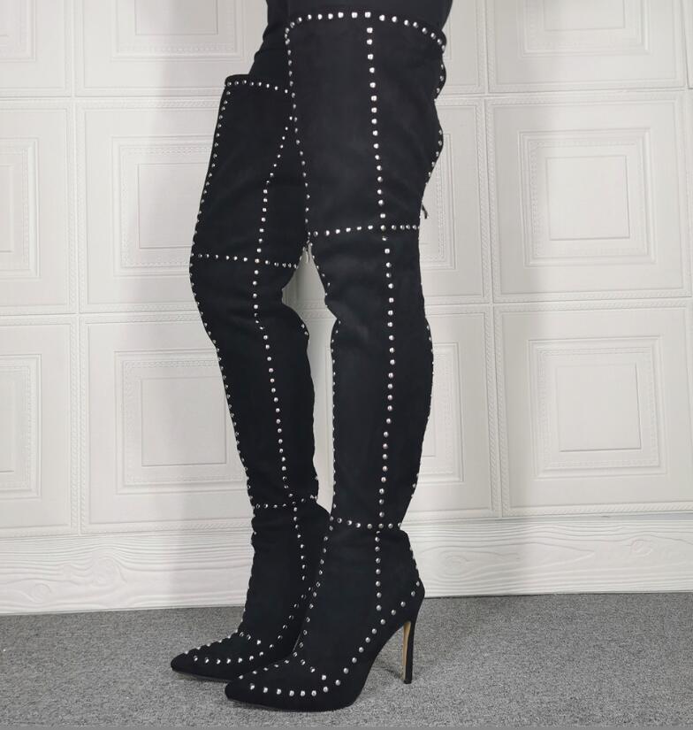 Black Pointed Rivet Stiletto Heel Stretch Women's Boots
