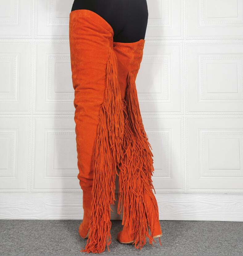 Orange Thick High Heel Pointed Toe Fringed Over-the-knee Women's Long Boots