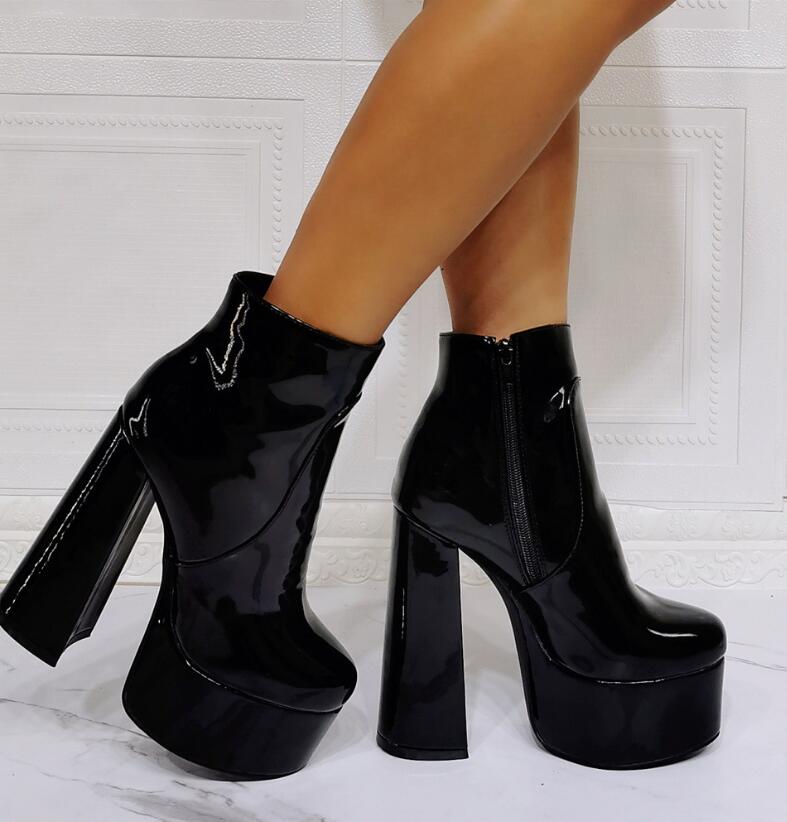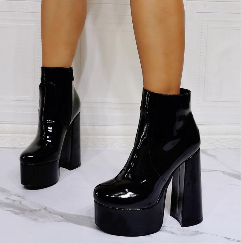 Black Patent Leather Thick Heel High Heel Women's Short Boots