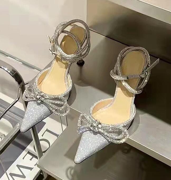 Bow Knot Rhinestone High Heels Sequins Pointed Hollow Strap Sandals Women's Crystal Shoes