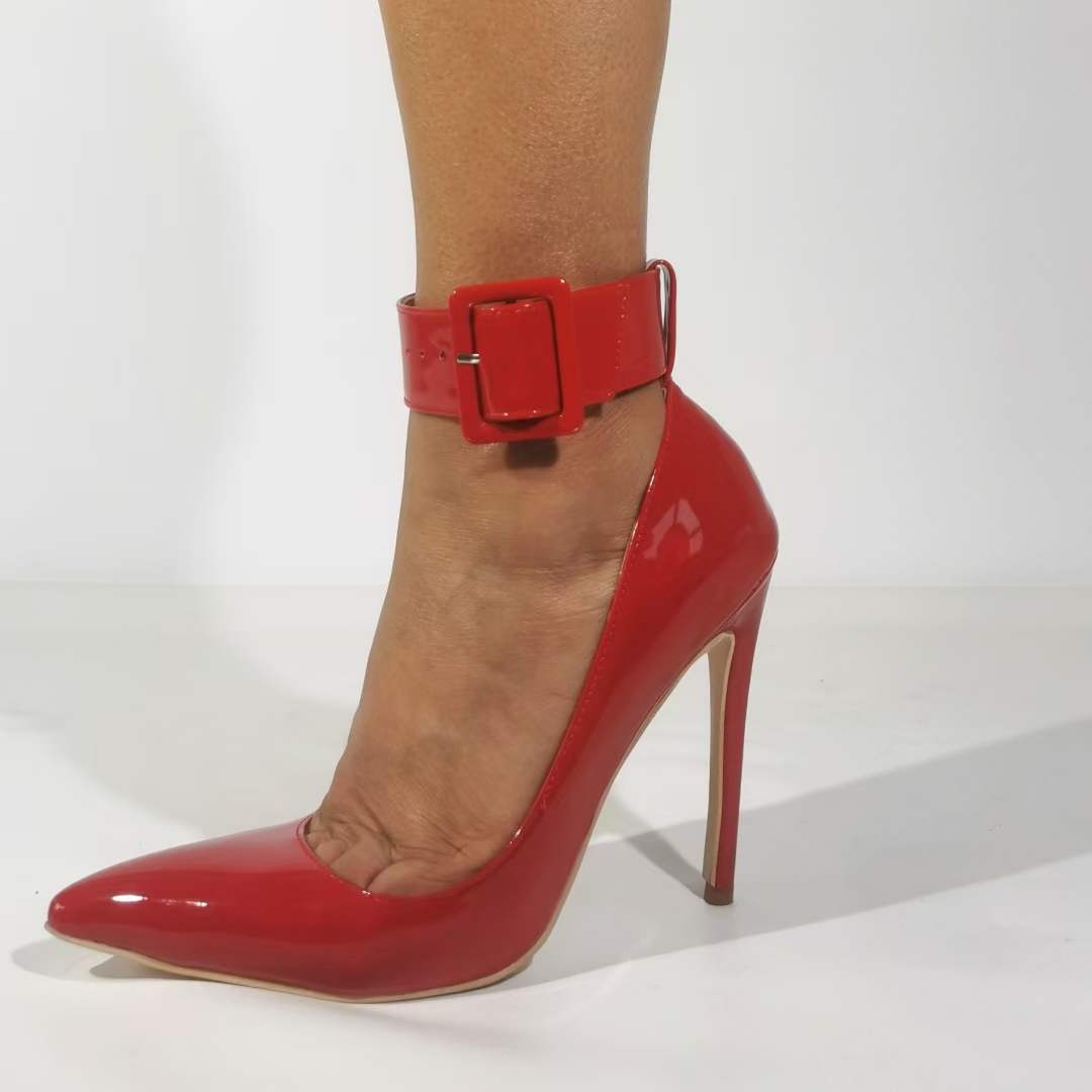 Red Matte Pointy Toe Pumps Big Buckle Stiletto Thin High Heel Wedding Shoes Celebrity Pumps