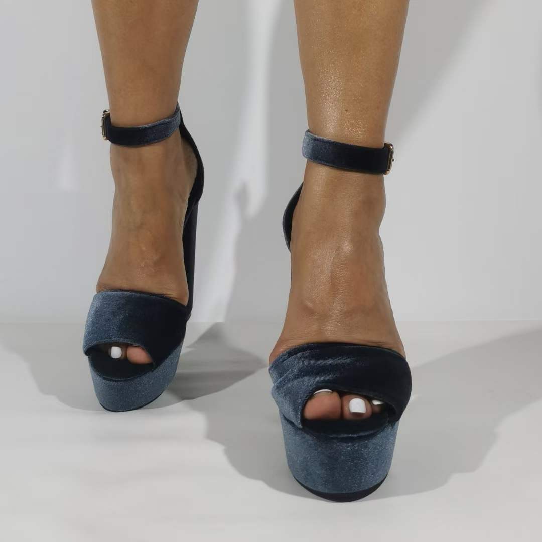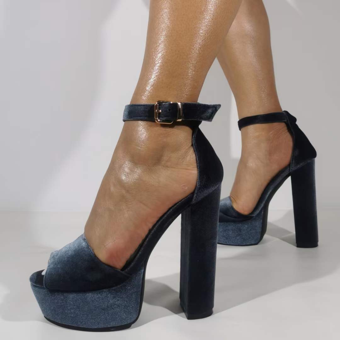 Female High Platform Chunky Heel Velvet Sandals Grey Ankle Straps square High Heel peep toe summer Pumps banquet shoes