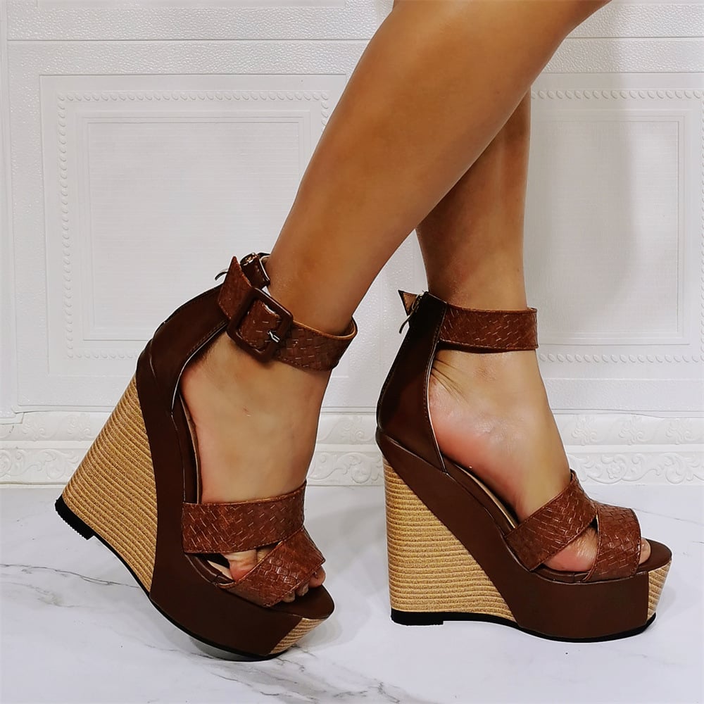 High Heels Platform Wedge Heel Sandals Slingback Sexy Open Toe Wood Grain Banquet Large Size Sandals