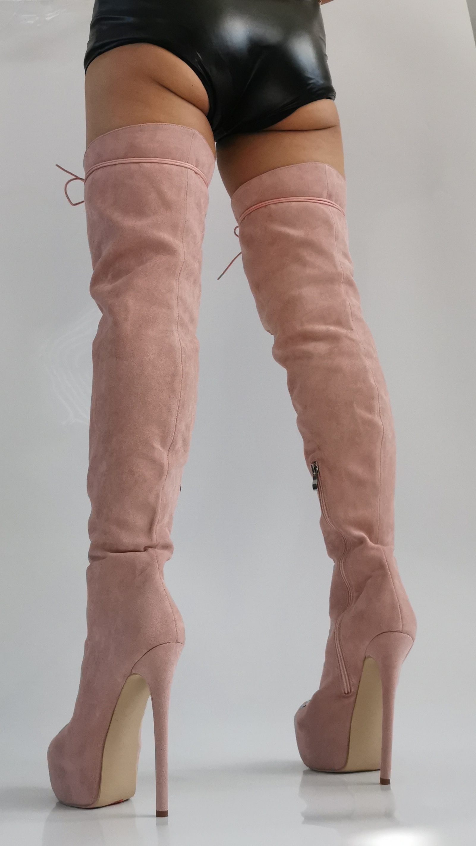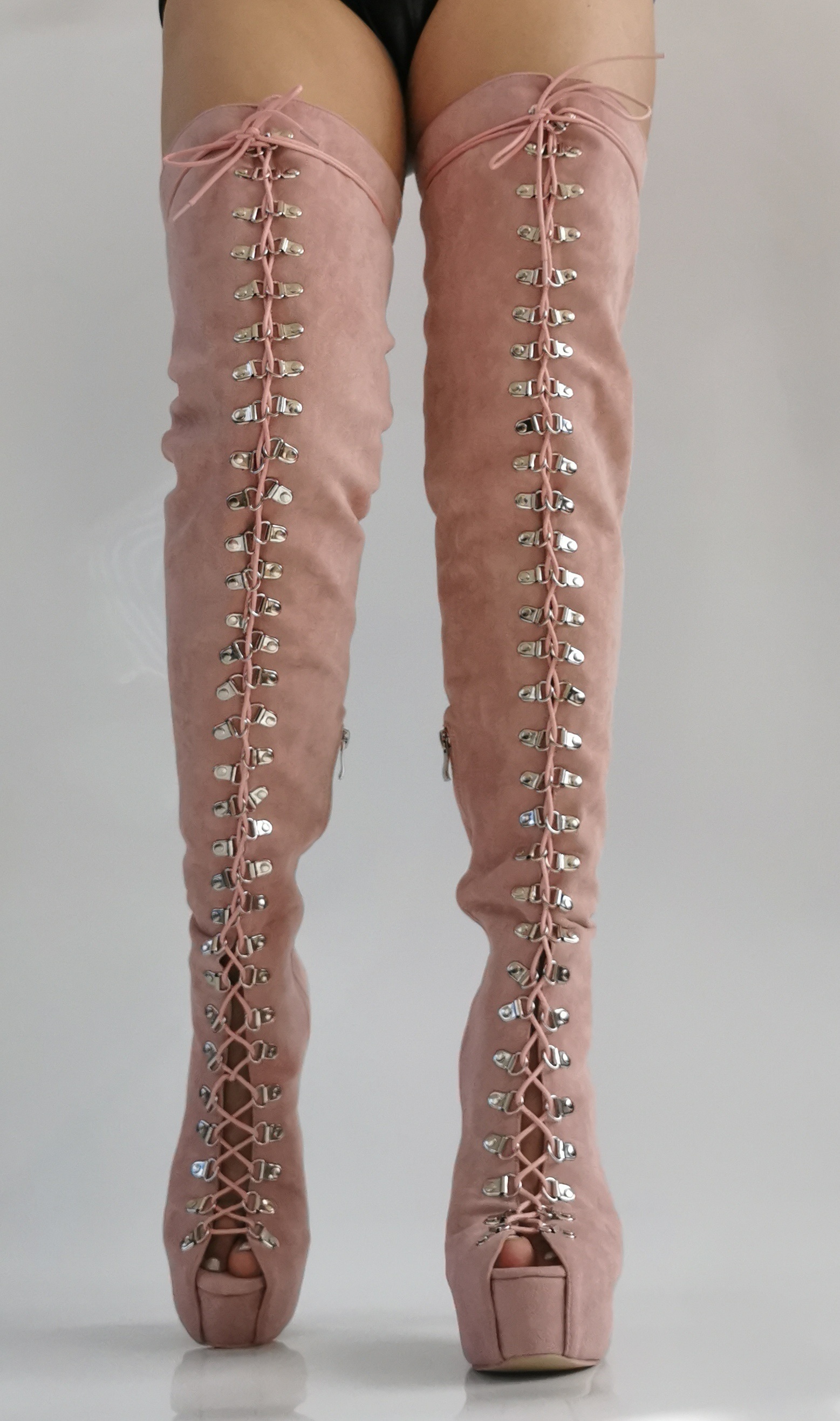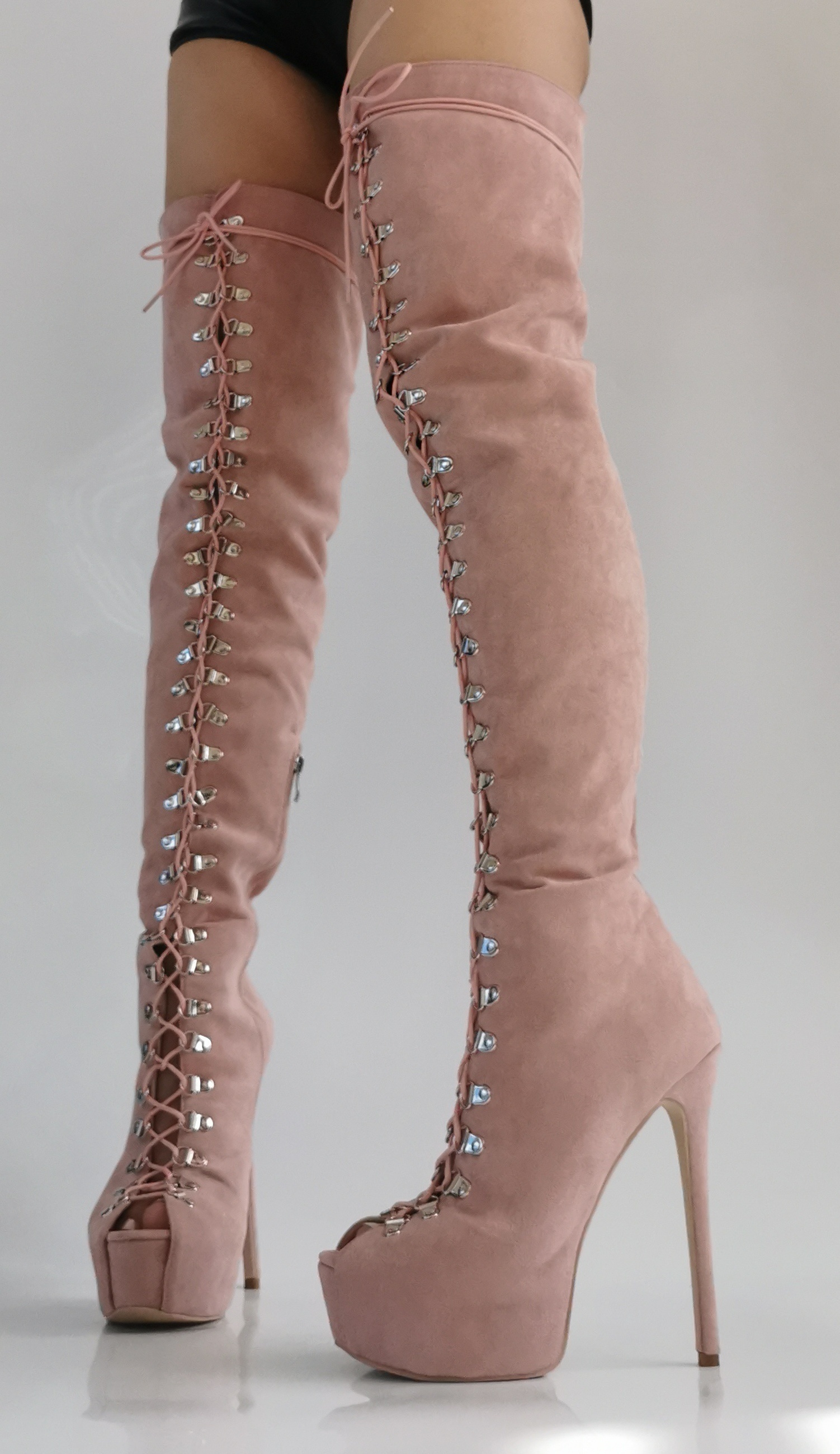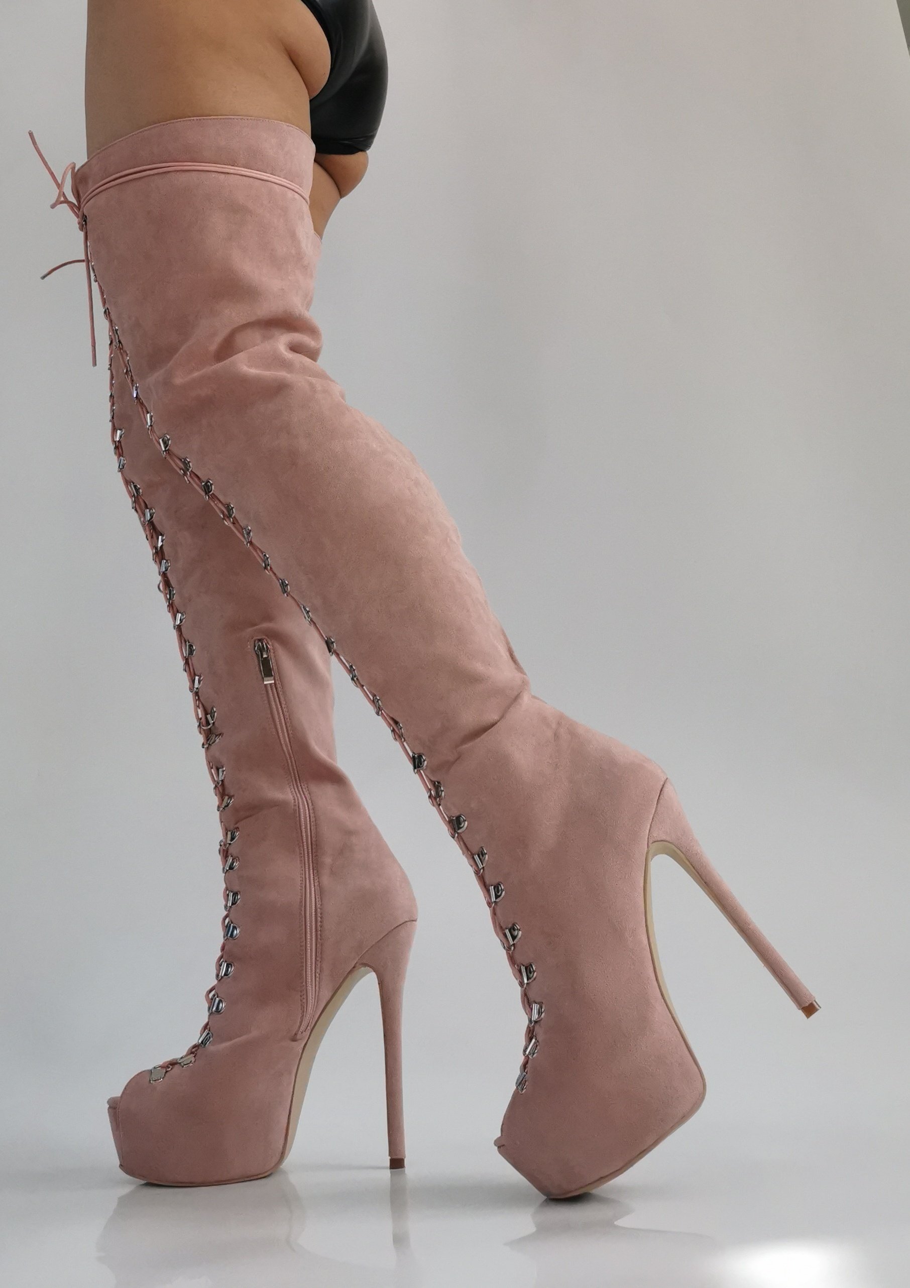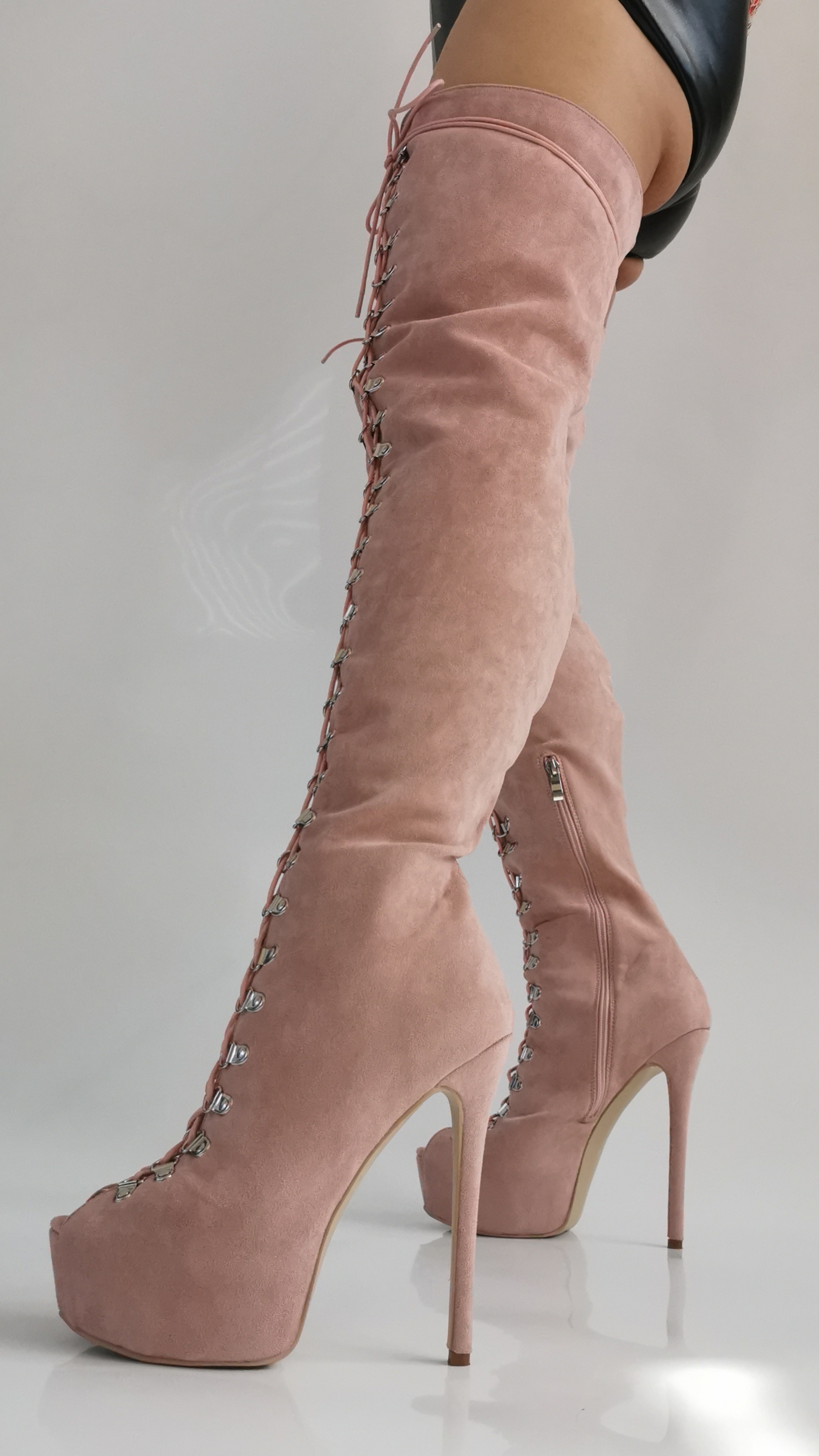 New Women Suede Thigh High Peep Toe Lace Up Stiletto Boot