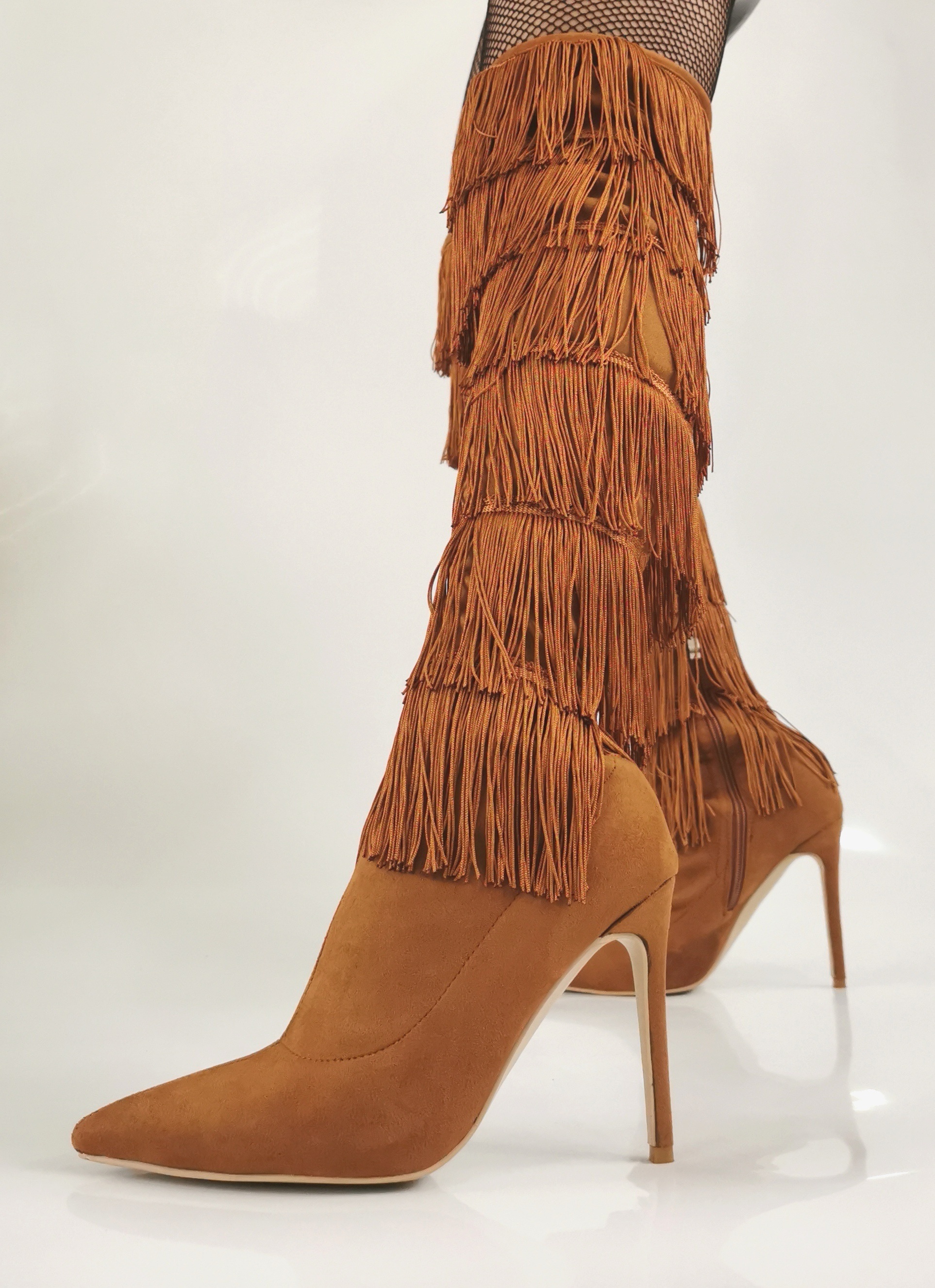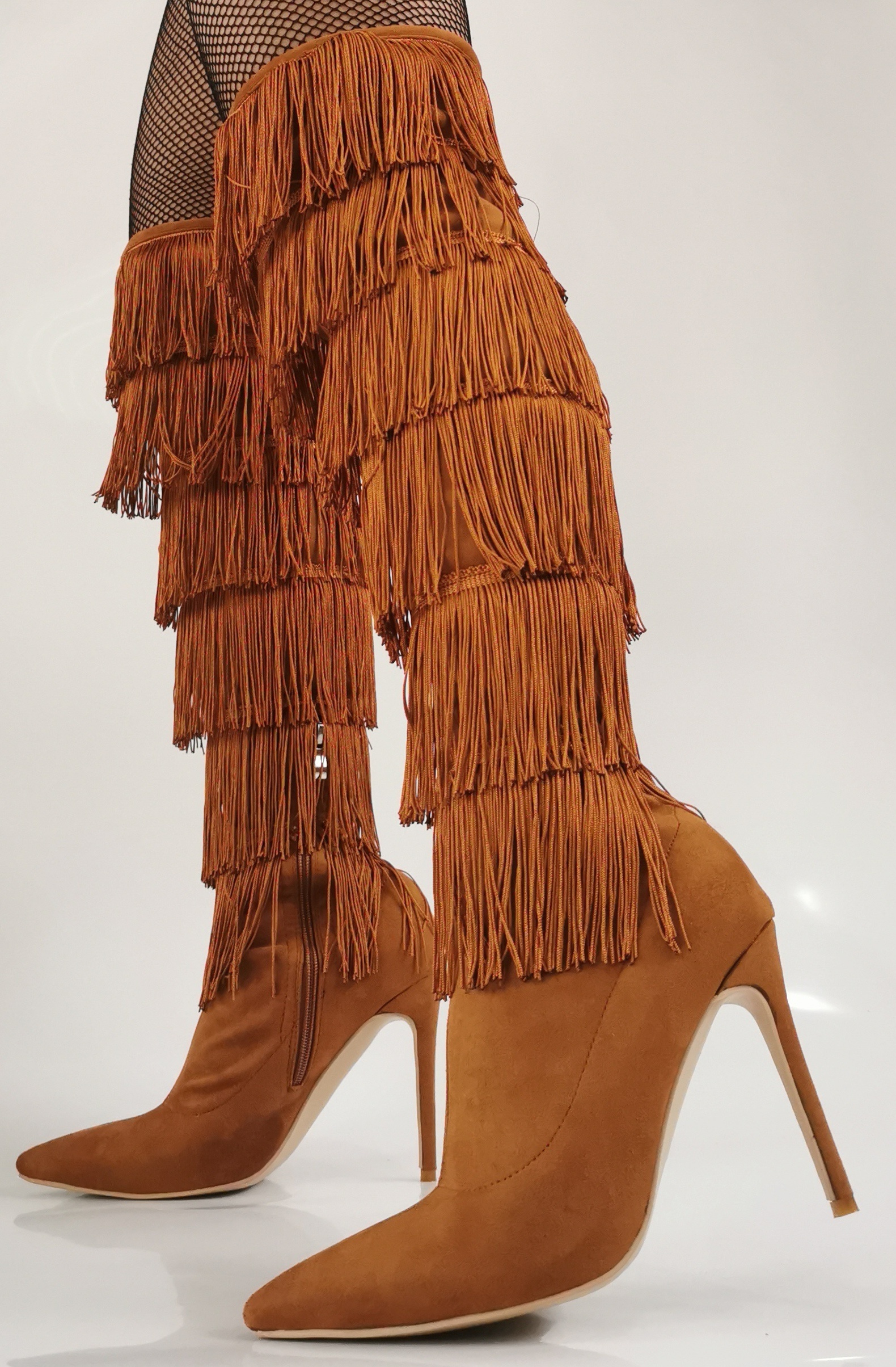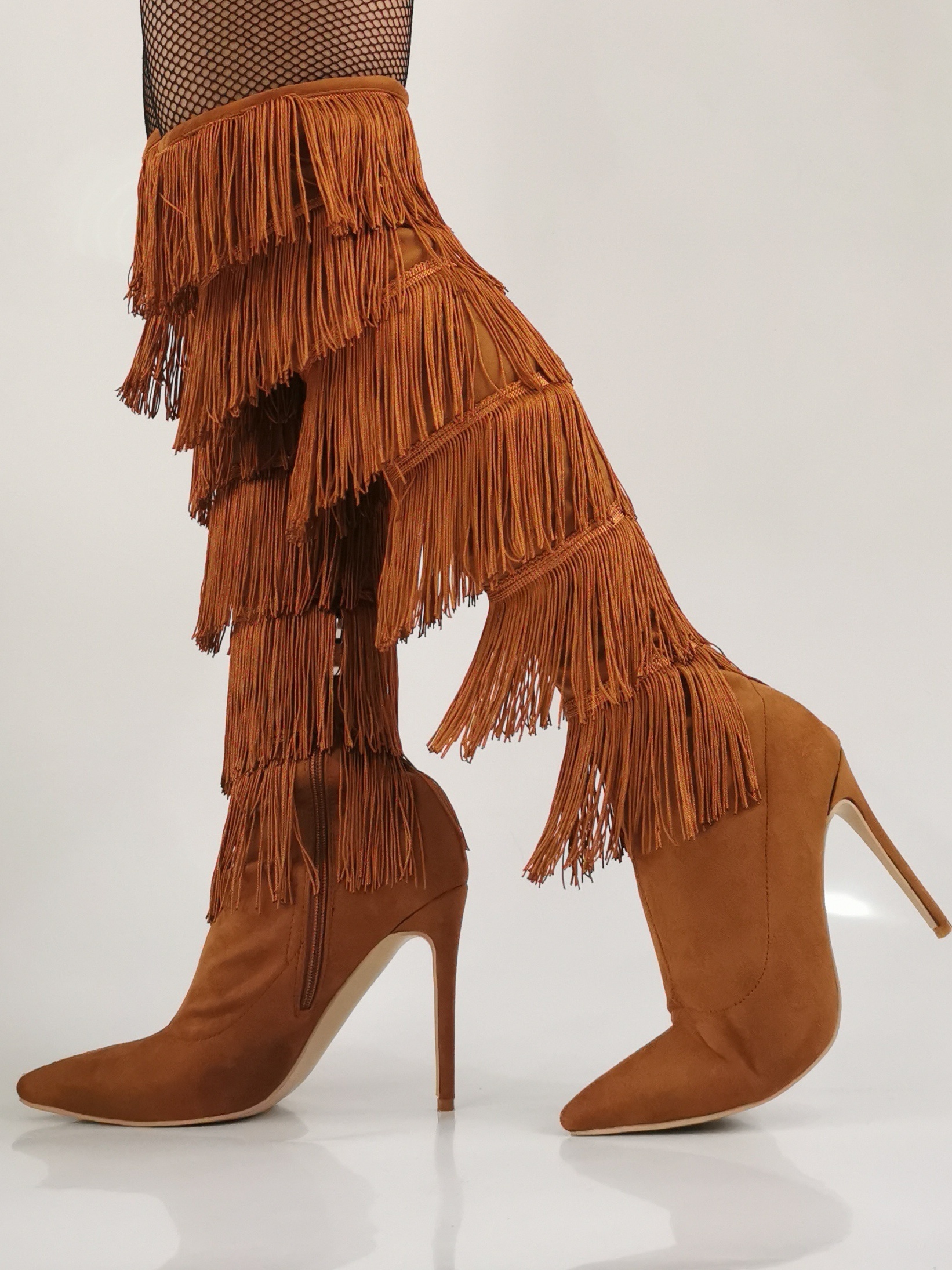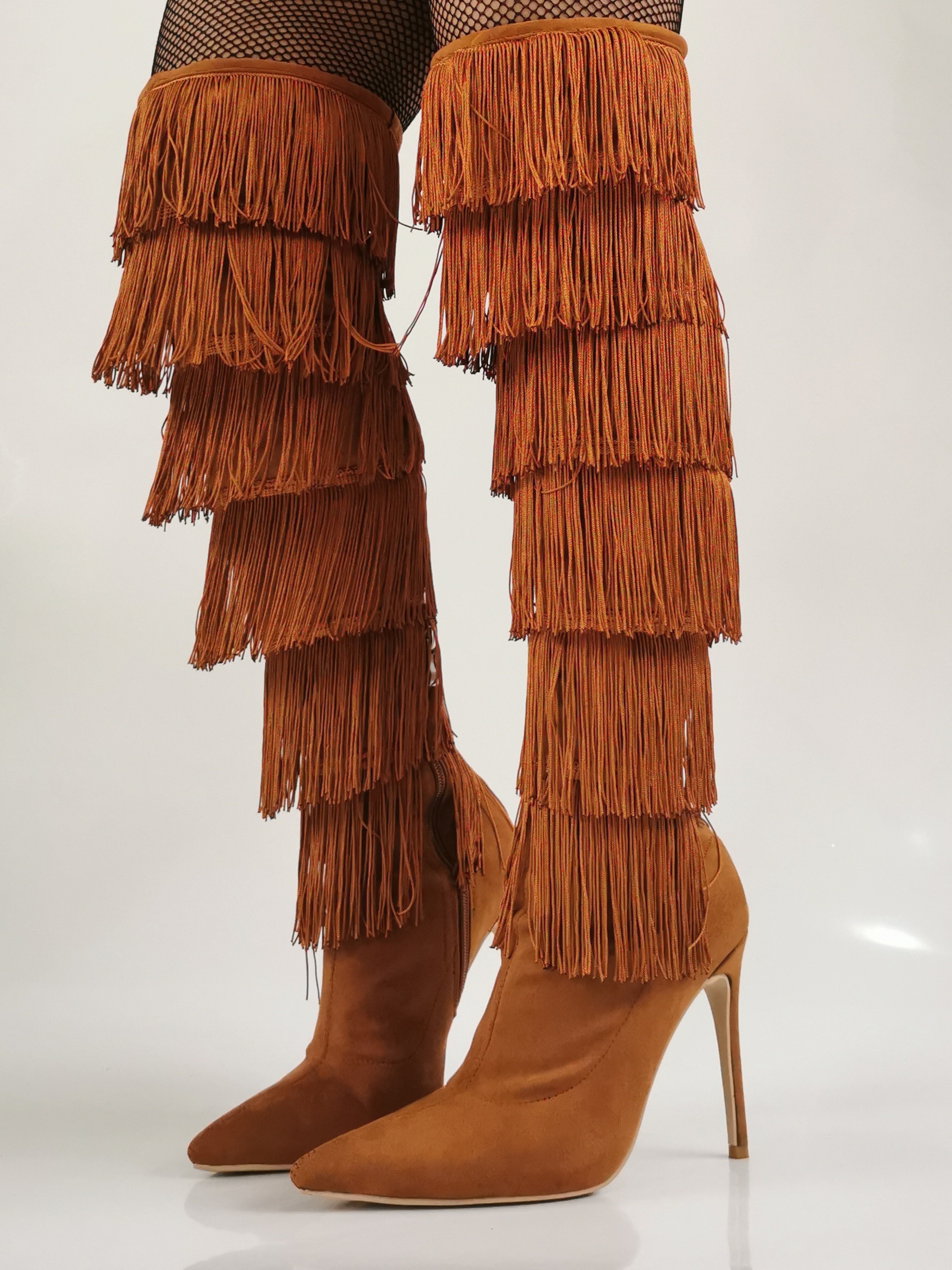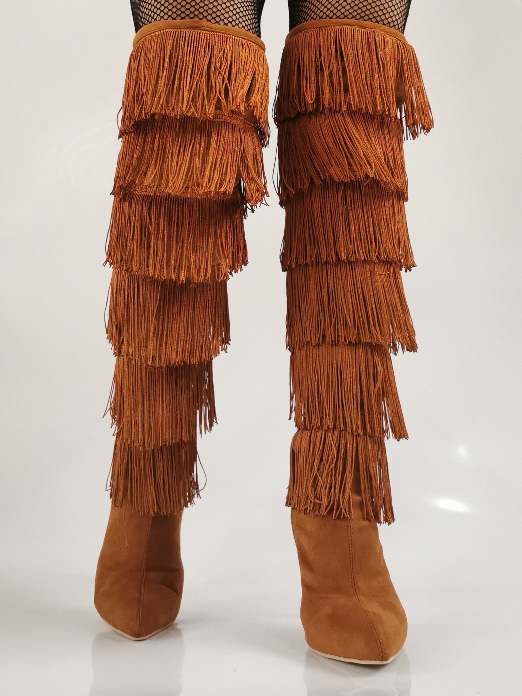 Fashion Multi-layered Fringe Over The Knee Boots Brown Suede Stretch Fabric Pointed Toe Zipper Winter Tall Boots