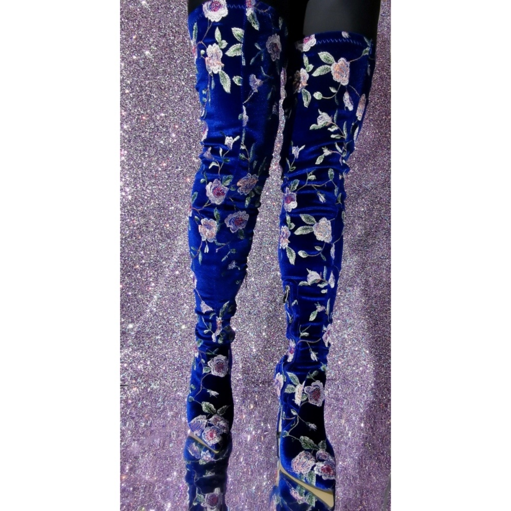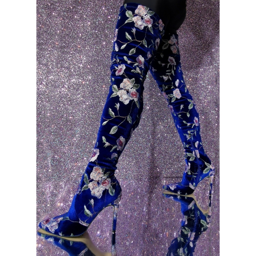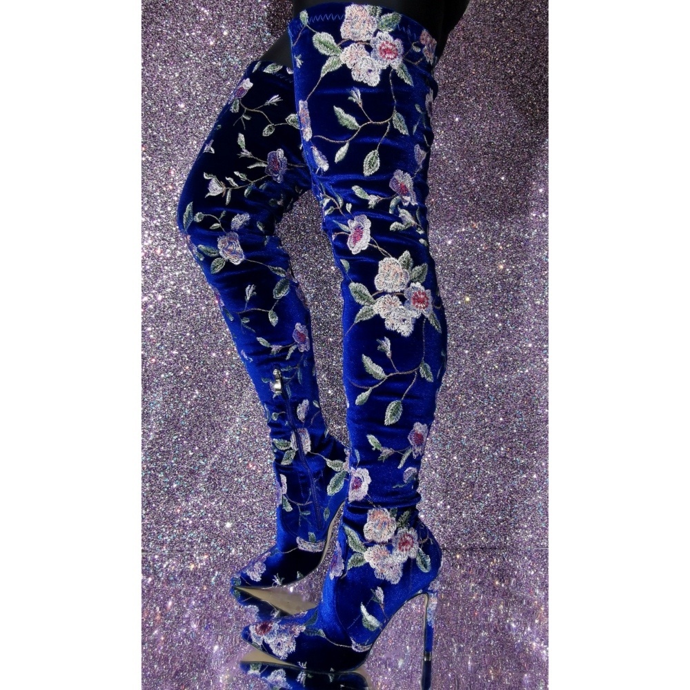 Super Women Over-the-Knee Boots Velvet Embroidered Heels Boots Blue Shoes Woman