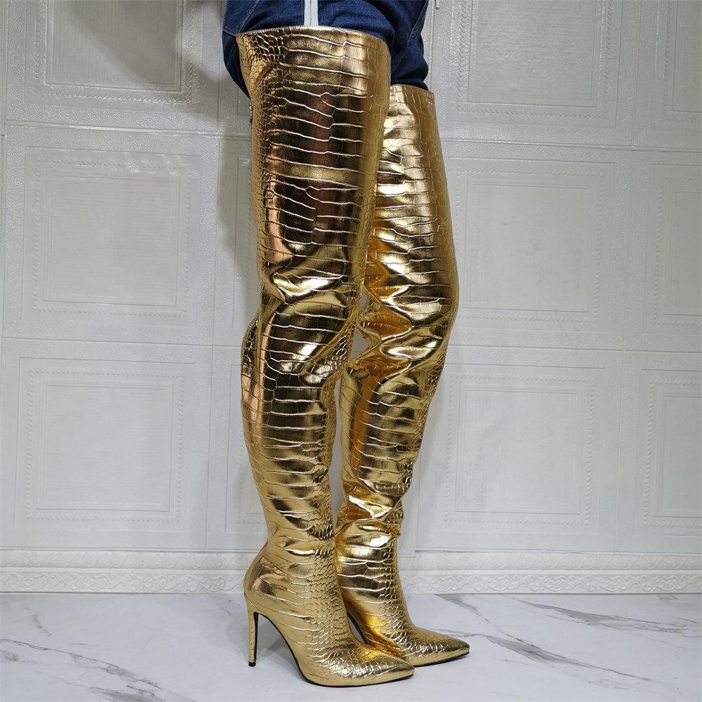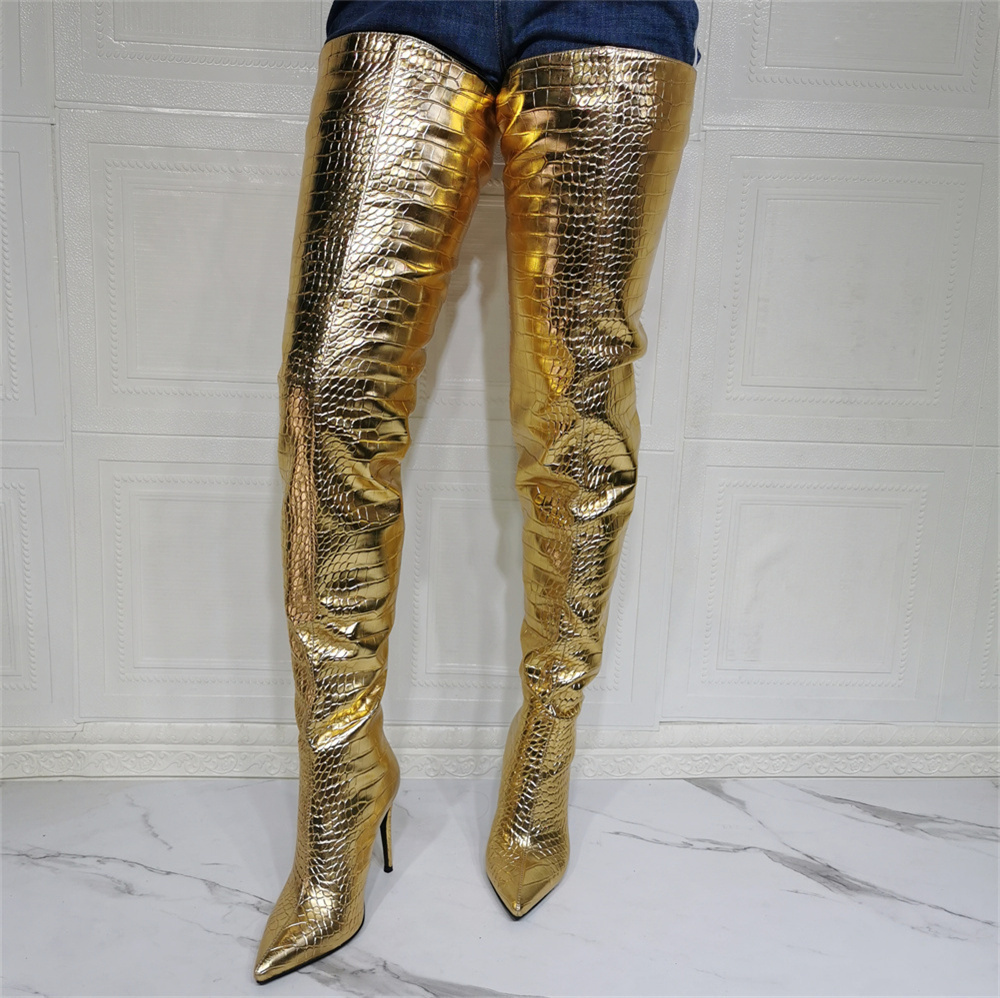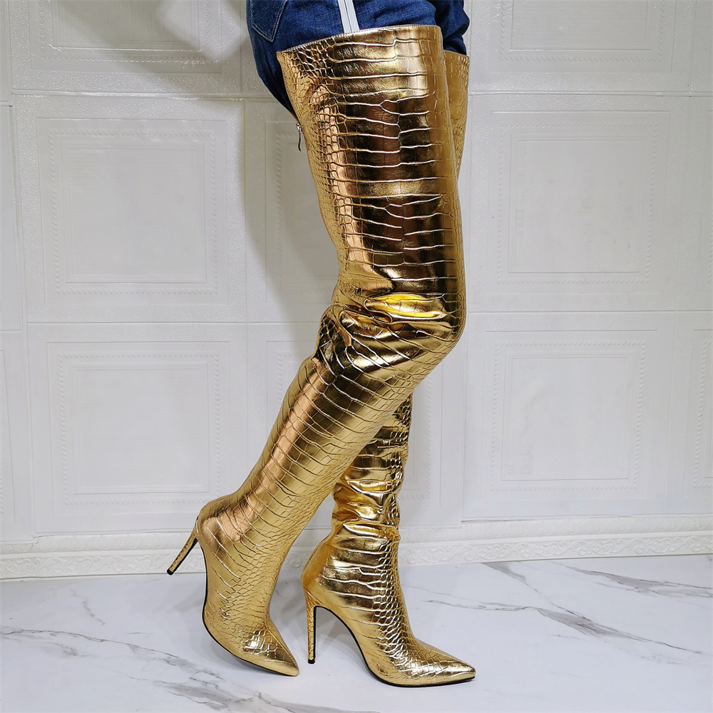 Punk Stiletto Over Knee Boots, Gold Python Snake Print Leather High Heels Thigh Style