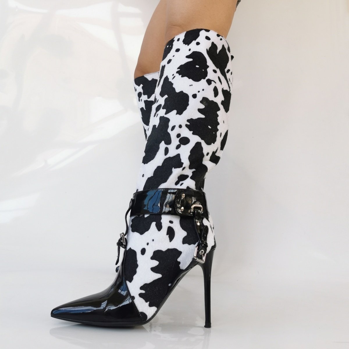Stiletto High Heeled Ankle Boots, White Black Cow Print Thin Bootie, Sexy Fashion Designer Hot Special Dressy Lace Up
