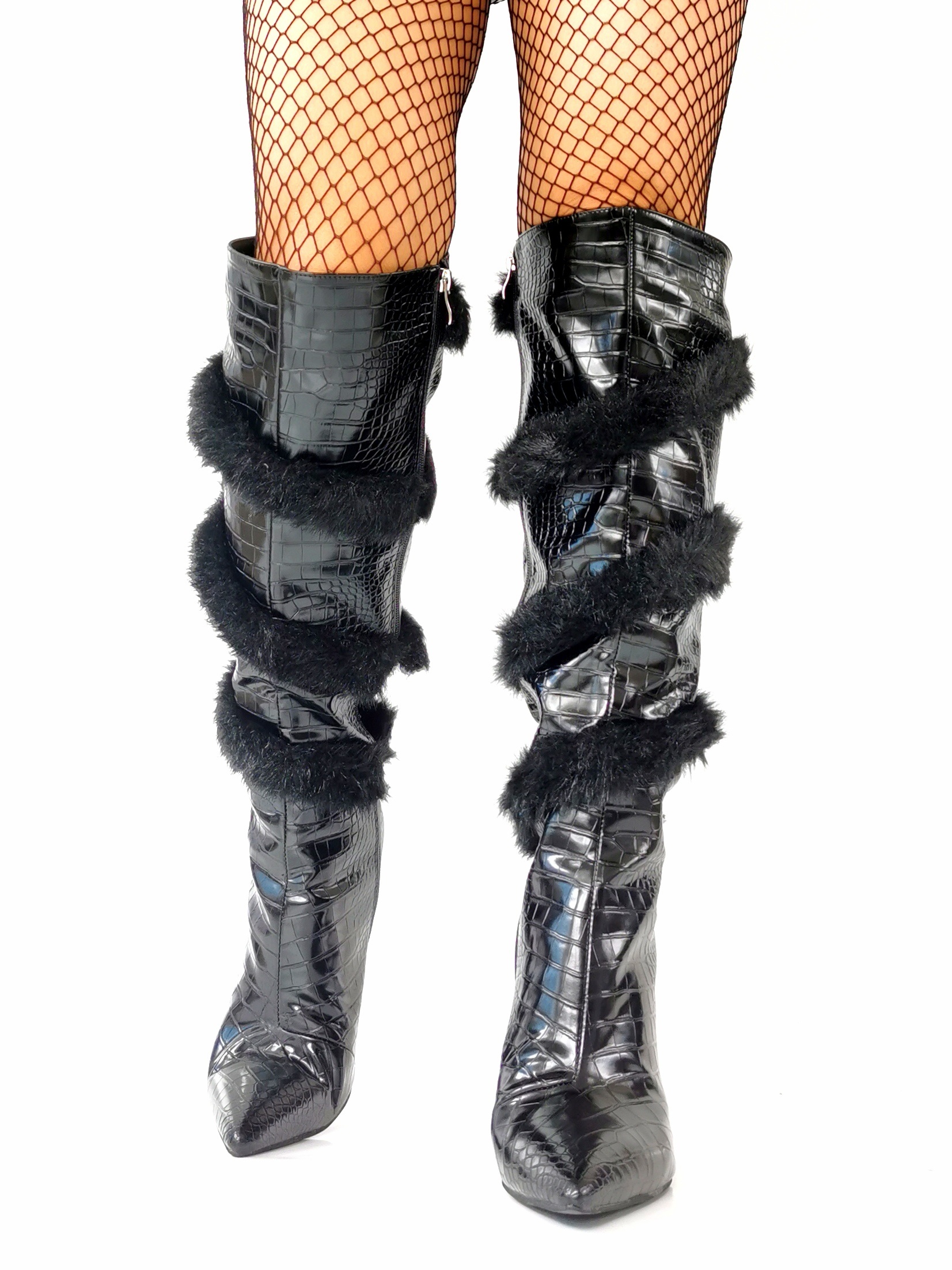 Womens Sexy Pu Leather Cony Hair Pointed Toe High Heels Side Zip Knee High Boots