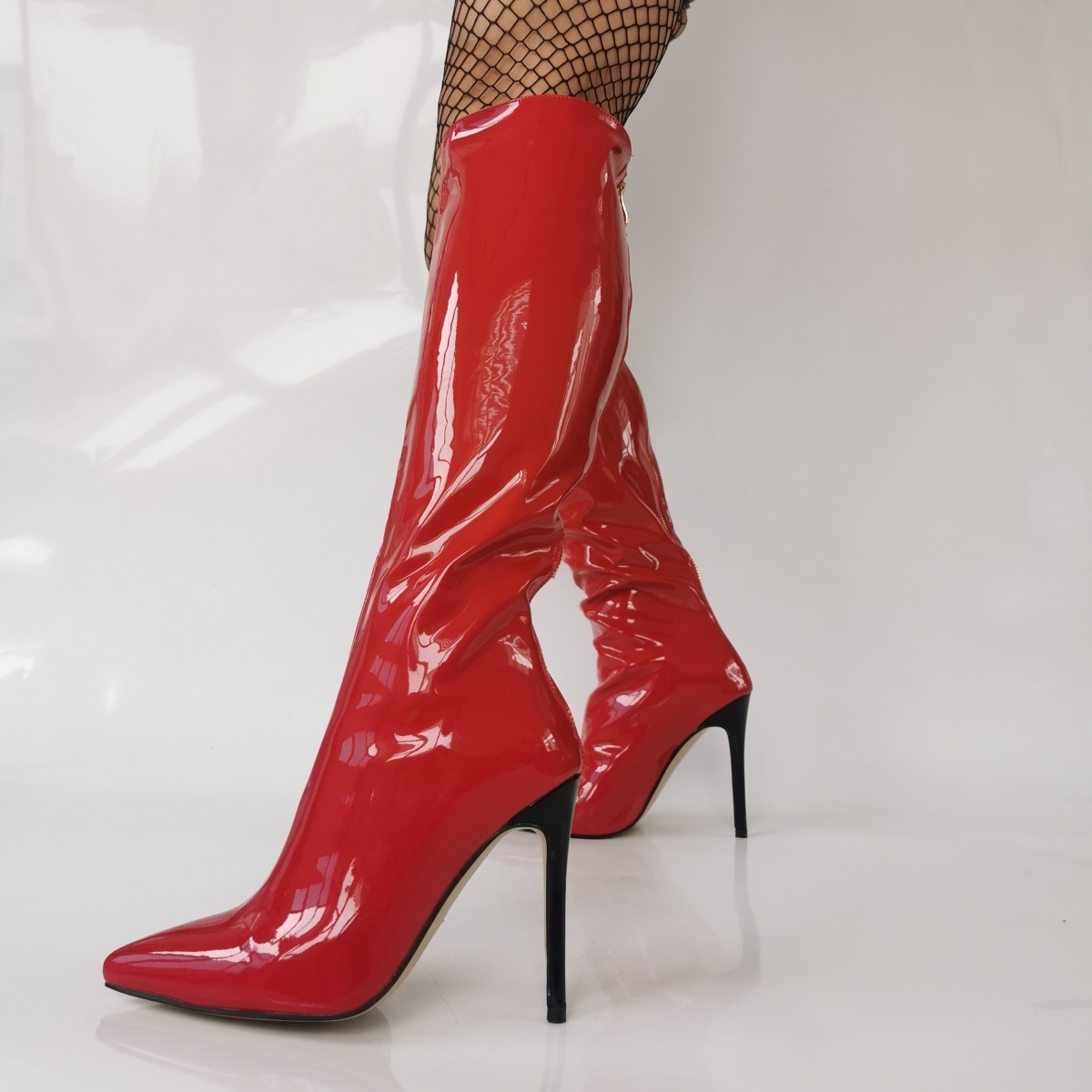 Women Knee High Boots Full Zip Up Shiny Pointed Toe Stiletto High Heels Shoes