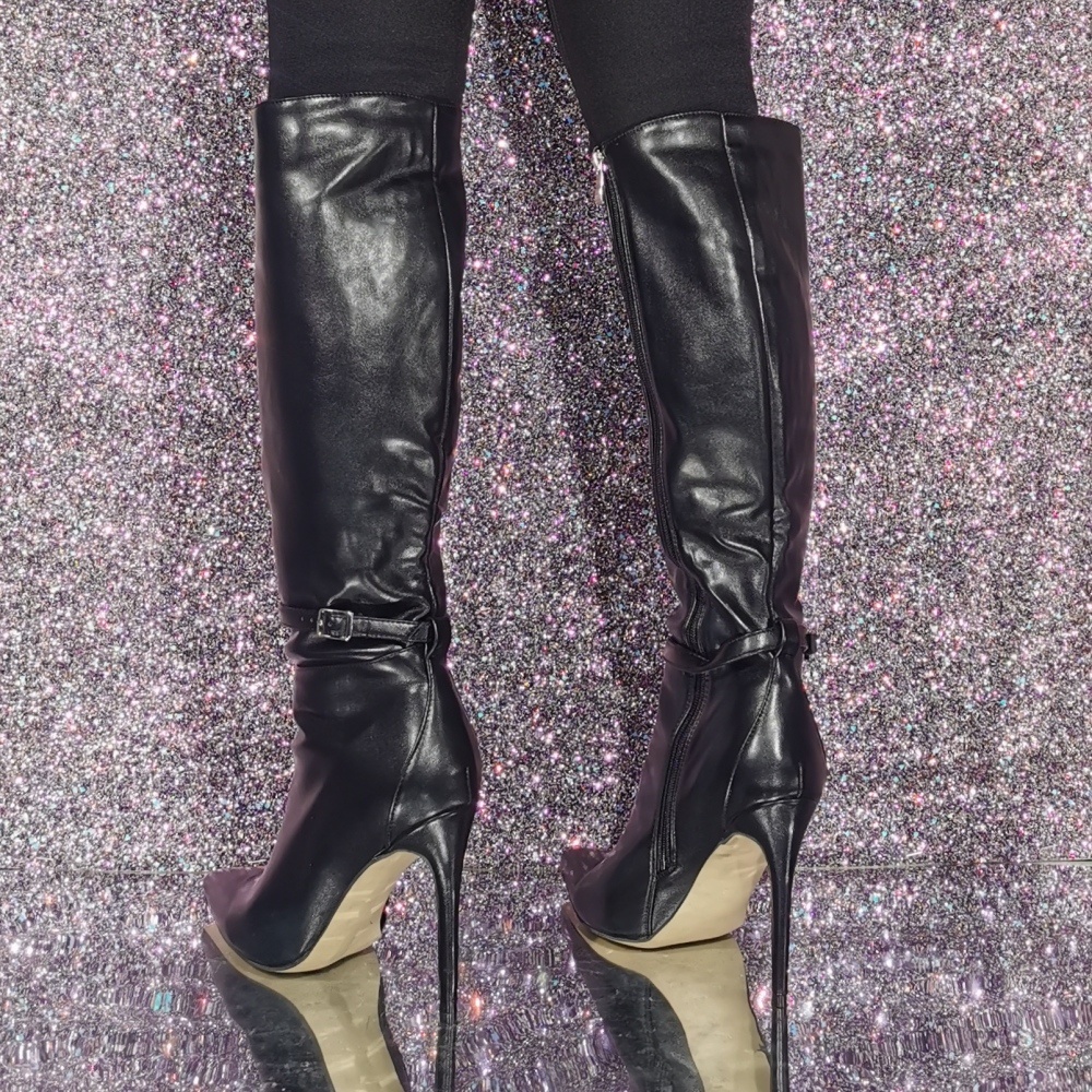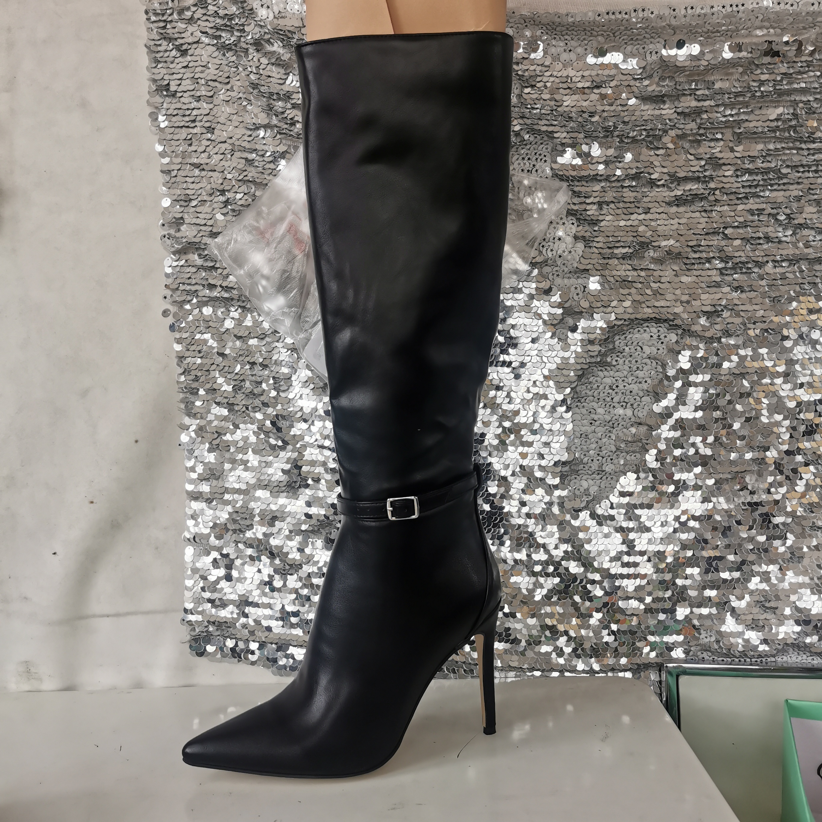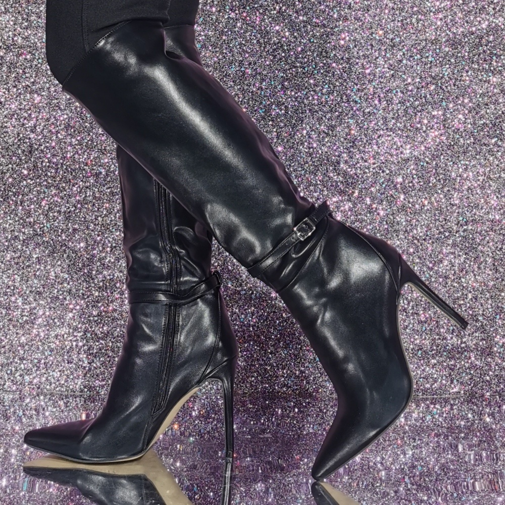 Black High Heel Knee High Boots Pointed Toe Buckle Detail Knee Length Boots
