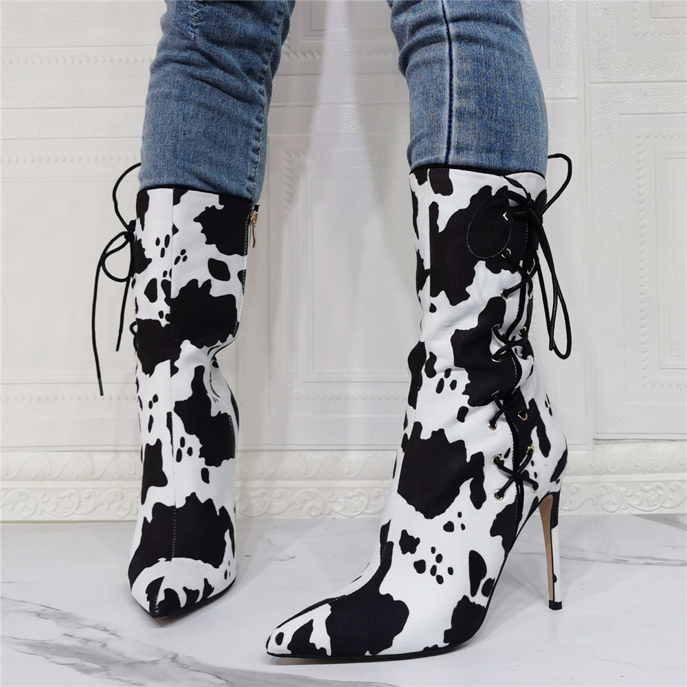 New Fashion Women Ankle Boots Stiletto Heels Boots Pointed Toe Gorgeous Cow Pattern Party Shoes Ladies